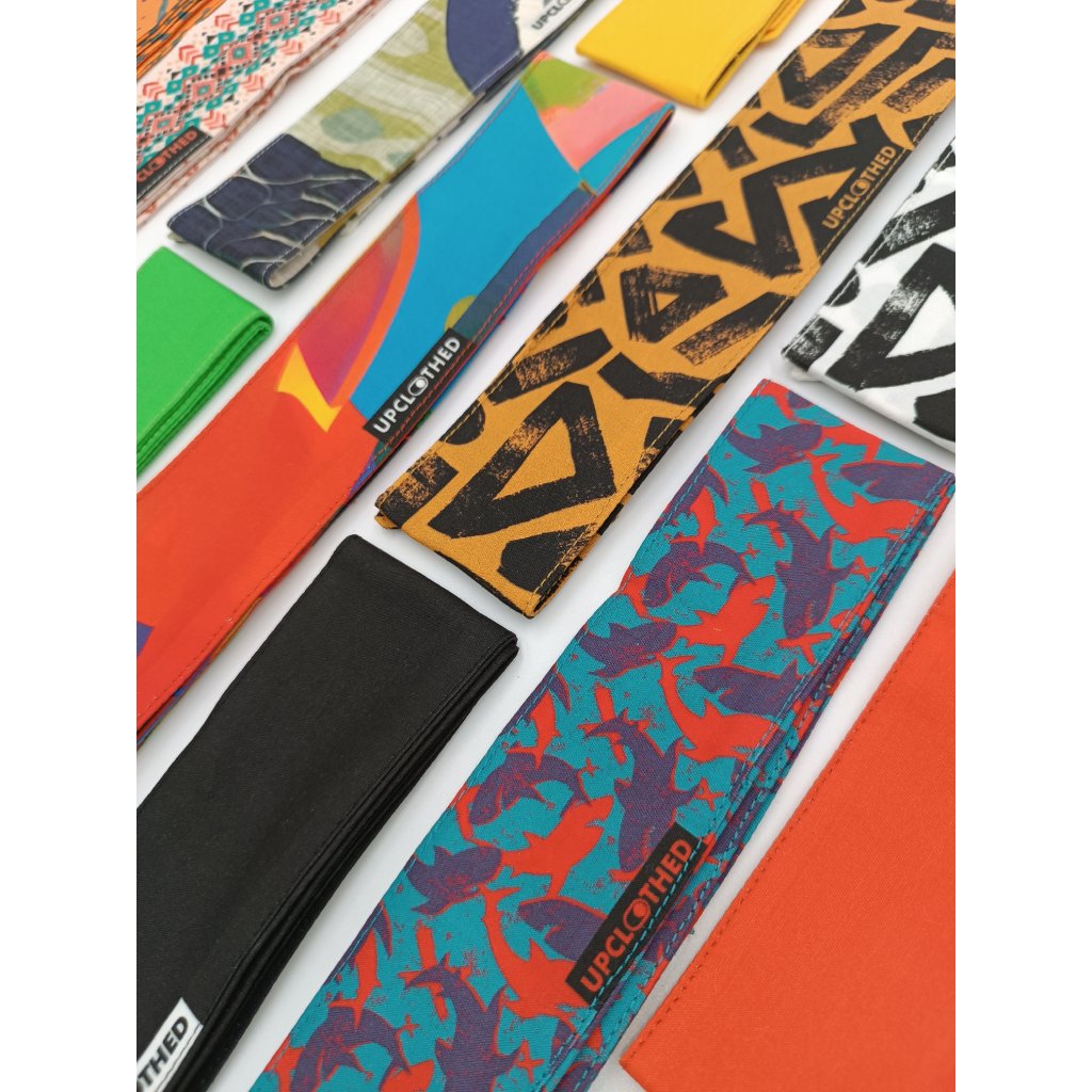 Obsah balení: zavazovací čelenka, textilní fix, cestovní sáček z organické bavlny