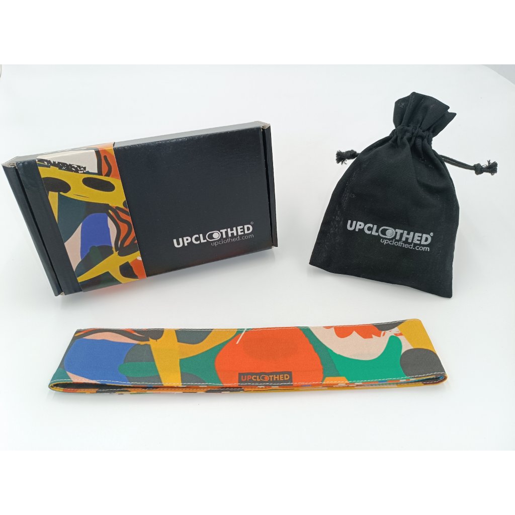 Obsah balení: zavazovací čelenka, textilní fix, cestovní sáček z organické bavlny