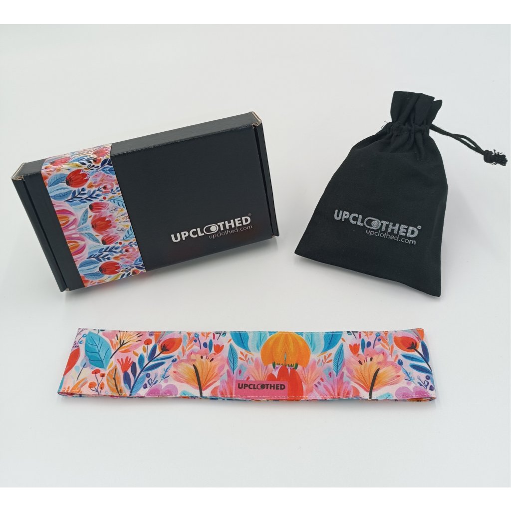 Obsah balení: zavazovací čelenka, textilní fix, cestovní sáček z organické bavlny