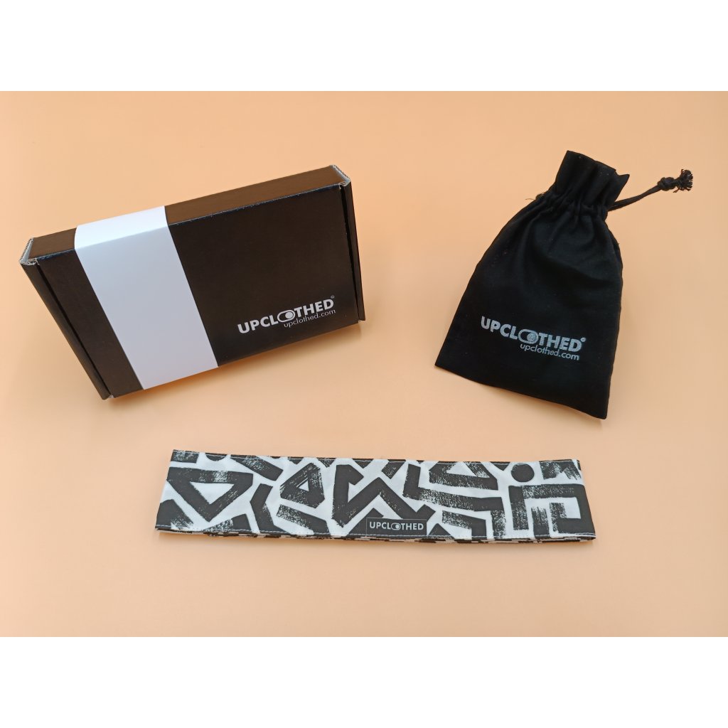 Obsah balení: zavazovací čelenka, textilní fix, cestovní sáček z organické bavlny