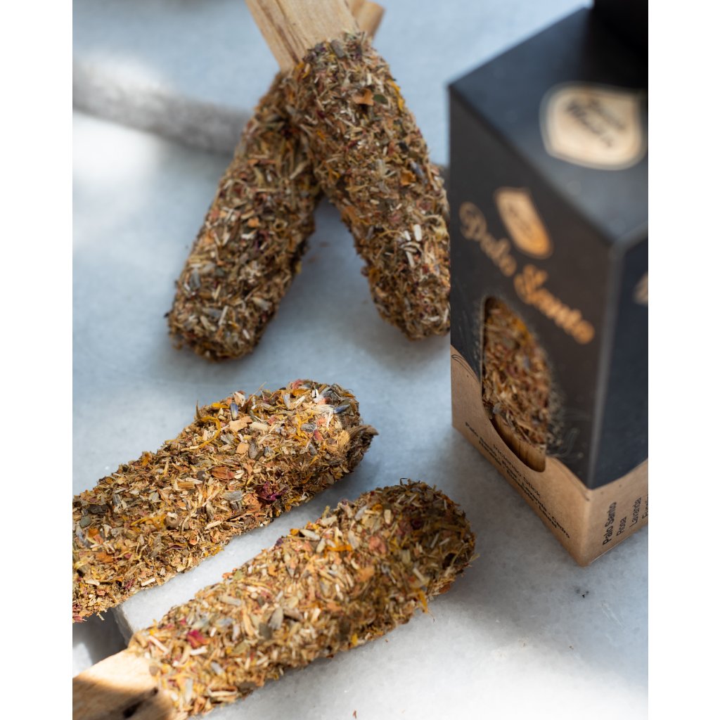 Obsah balení: 1 špalíček Palo Santo obalený bylinkami a květy. Délka cca 10 cm.